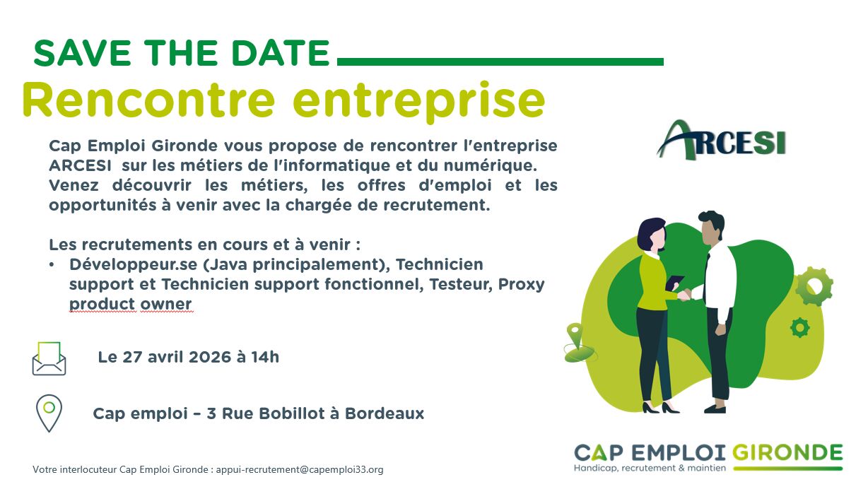 Cap Emploi Gironde vous propose de rencontrer l'entreprise ARCESI sur les métiers de l'informatique et du numérique. Venez découvrir les métiers, les offres d'emploi et les opportunités à venir avec la chargée de recrutement.