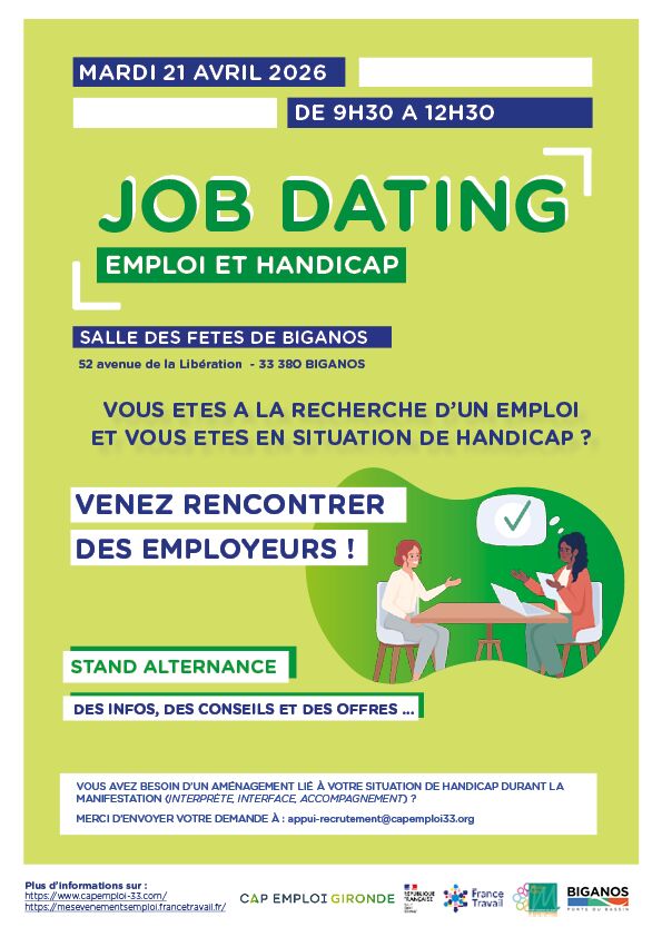 Cap emploi Gironde, France Travail Nouvelle-Aquitaine, la Ville de Biganos et les Mission Locale du Bassin d'Arcachon et du Val de L'Eyre organisent un job dating emploi et handicap le mardi 21 avril de 9h30 à 12h30, à la salle des fêtes de Biganos.