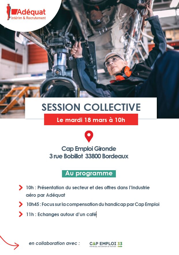 Au programme : 10h : Présentation du secteur et des offres dans l’Industrie aéronautique par Adéquat Intérim 10h45 : Focus sur la compensation du handicap en emploi par Cap Emploi Gironde 11h : Echanges autour d’un café