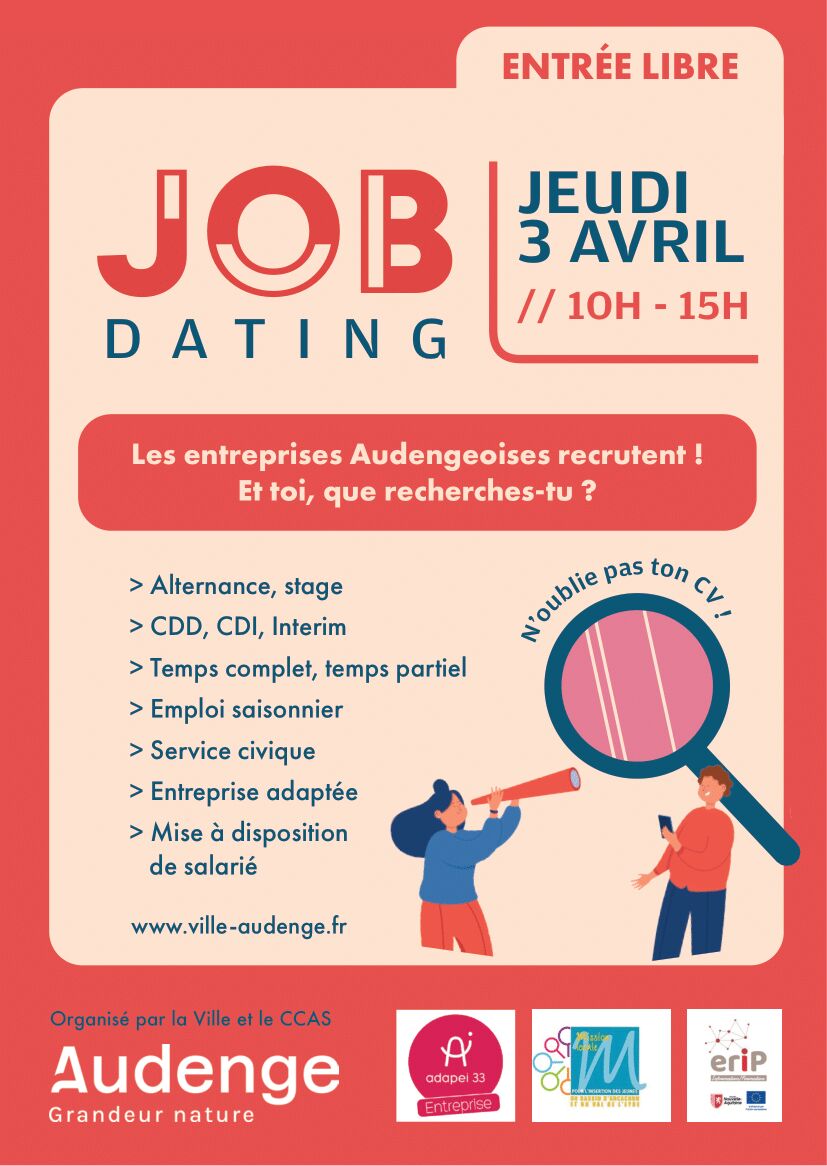 La Ville d’Audenge, le CCAS, l'Adapei de la Gironde et la Mission Locale du Bassin d'Arcachon et du Val de L'Eyre organisent la première édition du Job Dating d’Audenge.